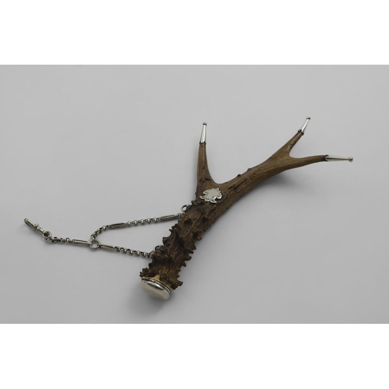 A LATE VICTORIAN MOUNTED DEER ANTLER VINAIGRETTE with a plain hinged cover, a suspensory chain, and a vacant shield cartouche, gilt interior, unmarked, probably Scottish c.1900; 8" (20 cms) long