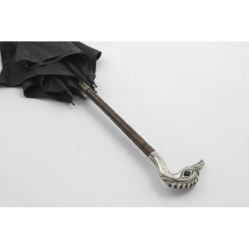 AN EARLY 20TH CENTURY BLACK SILK UMBRELLA with a mounted cane shaft and a bird mask handle, set with green glass eyes, by Frank Tallis, London 1917; 37" (94 cms) long