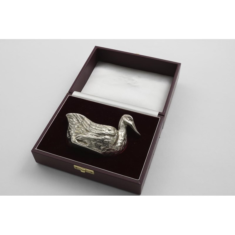in the form of a shoveler duck, with textured plumage and a gilt interior, by E & J. Barnard, London 1864, retailed by "Thomas's Bond St." (in a fitted case); 4.5" (11.5 cms) long; 4.4 oz