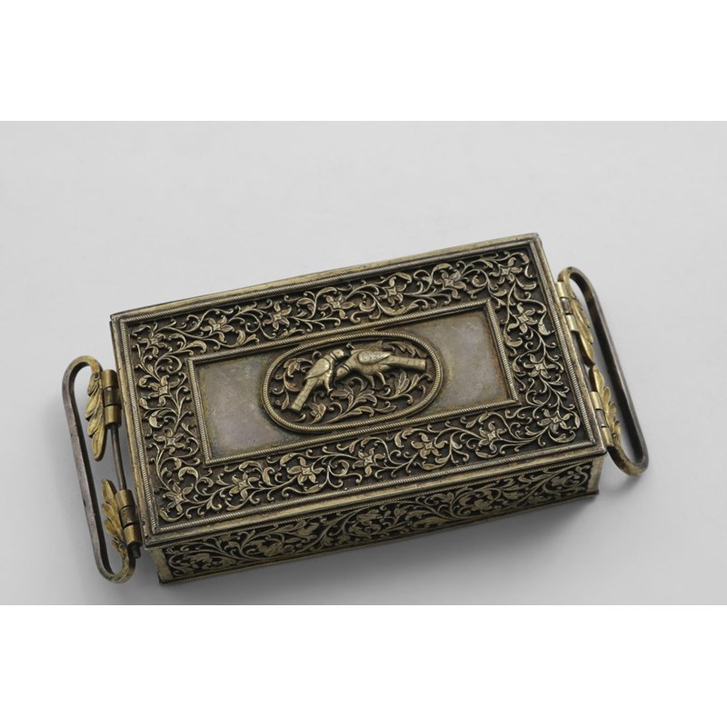 plain rectangular with blind-fret borders of trailing foliage and flowers and two birds in the centre, the hinged cover with lock, unmarked, probably Indian 1st half of the 19th century; 6.1" (15.5 cms) long; 12.5 oz