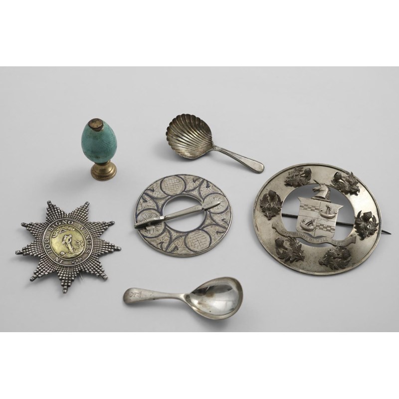 with coat of arms, motto & applied thistles, the reverse with a large Gaelic inscription, a late 19th century parcelgilt badge or Order of the Knights Templar, unmarked, an 18th century niellowork annular brooch with the scratched initials & date "MMD AMI 1784", unmarked, probably Scandinavian, together with two caddy spoons and a gilt-metal & enamel stamp moister; the plaid brooch 4" (10 cms) diameter (6)