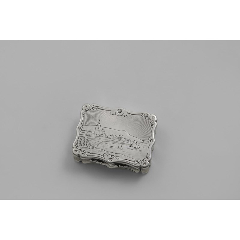 of shaped rectangular outline with a view of a coastal town on the cover, the base with a central cartouche, inscribed "Lucy", gilt interior, by Nathaniel Mills, Birmingham 1847; 1.6" (4.2 cms) long