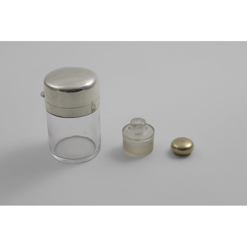 with a plain hinged cover, the internal stopper in the form of a scent bottle with a screw cup, the "stopper" with etched design no. "184740" and "Modele depose no. 6450" and "Germany no. 2522", by C & G. Asprey, London 1891 (retailed by Leuchars of Piccadilly); 4" (10 cms) high