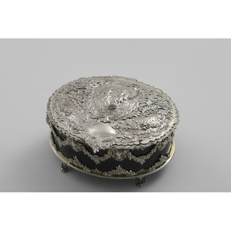 with a mounted tortoiseshell body and four small floral scroll feet, the cover with repousse-work and a courting couple in the centre, by George Fox, London 1892; 5.1" (13 cms) long