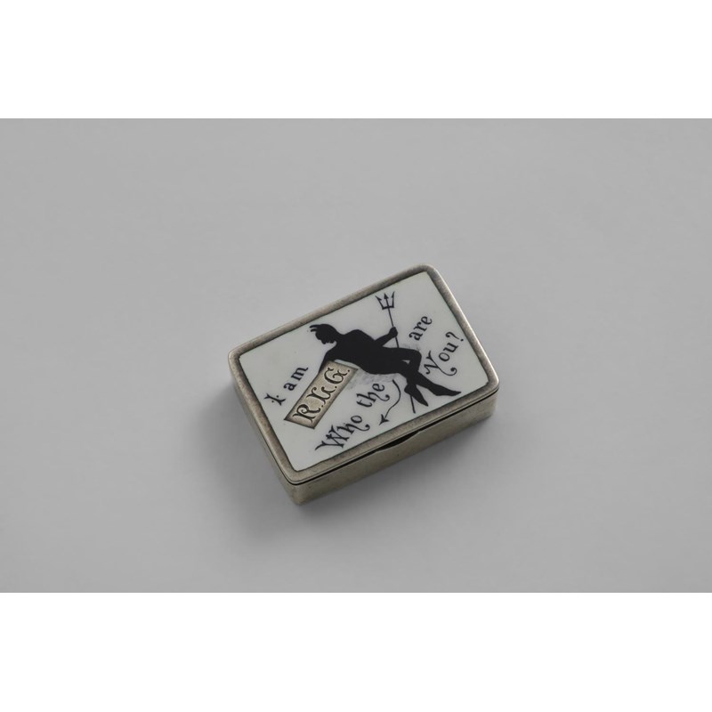 rectangular with plain sides, enamelled on the cover in polychrome with "I am R.L.G. Who the (devil) are you?", gilt interior, by Horton and Allday, Birmingham 1887; 1.6" (4.1 cms) long; 0.8 oz