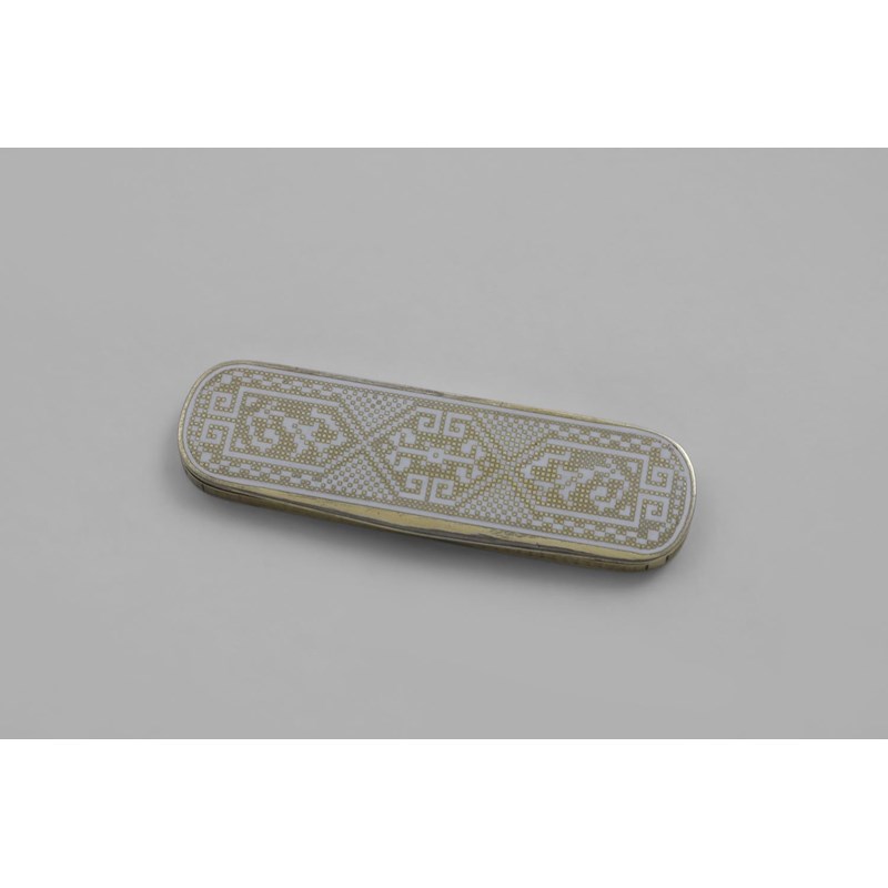 narrow rectangular form with roundel ends and a geometric pattern on the cover, with 'English import marks for London 1913 ("retailed by "Callow of Mount Street, Mayfair");  3.2"  (8.1 cms) long