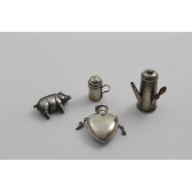 A small Edwardian pig pin cushion with textured hair, by Adie & Lovekin Ltd., Birmingham 1909, a miniature kitchen pepper, Chester 1893, a miniature coffee pot pepper, Birmingham 1900 and a small heart-shaped scent bottle, London 1896; the pig 1.6" (4 cms) long; 0.8 oz weighable silver (4)