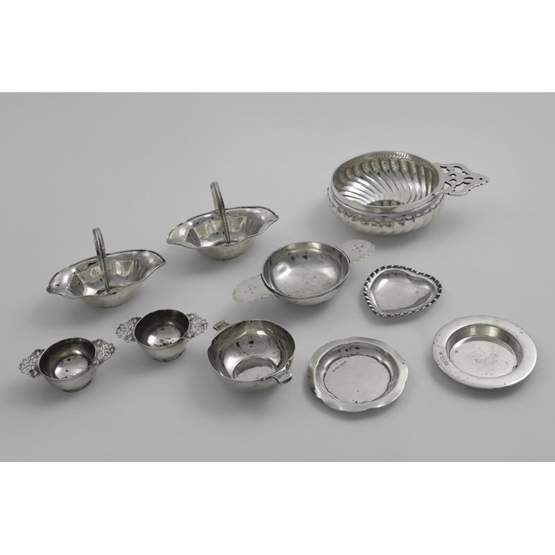 with a pierced handle and a swirl-fluted body, a pair of Scottish bonbon dishes with swing handles, by Hamilton & Inches, Edinburgh 1906 and seven other small dishes; the nut dish 4.8" (12.2 cms) diameter; 19.3 oz (10)