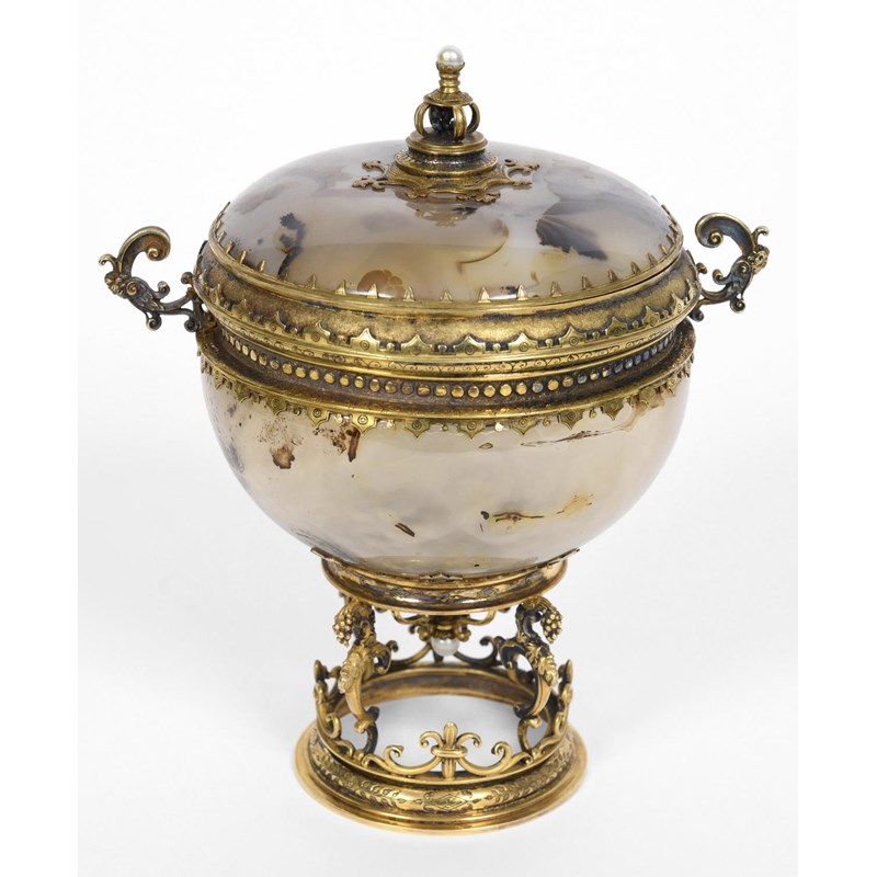 Squat circular shape, the creamy brown stone set in silver gilt mounts of Renaissance design with pearl finial and pendant on a pierced stand with vine decorated brackets, 19th century; approx. 15.5 cms high x 13.5 cms over handles