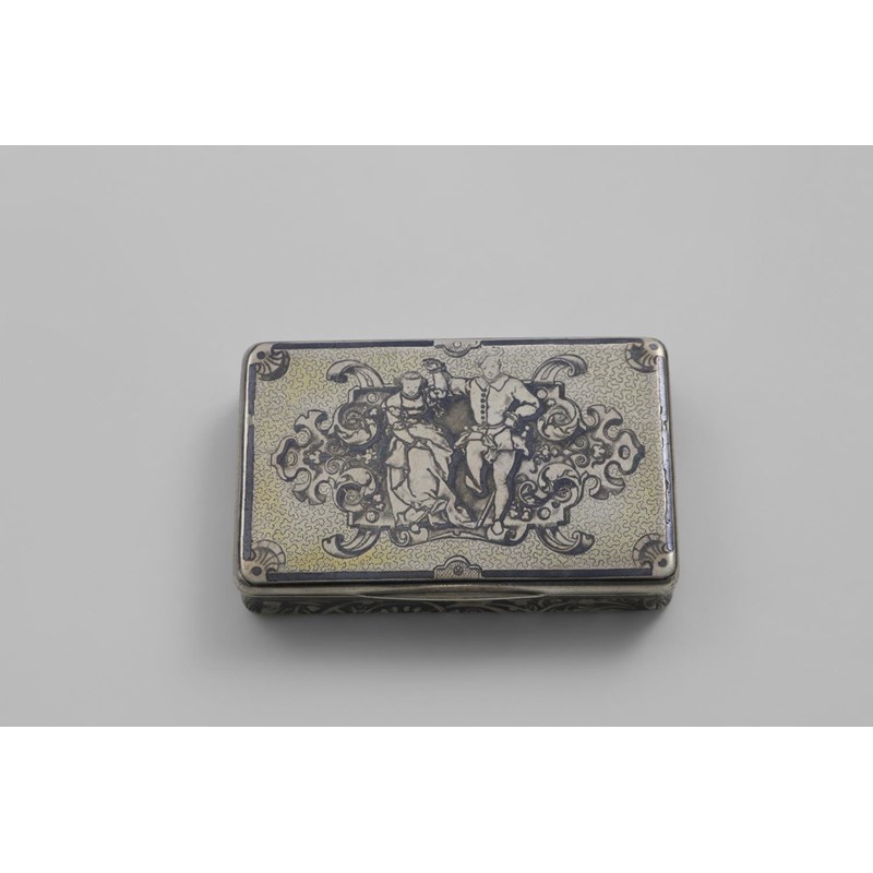 rectangular with rounded corners, the cover depicting a dancing couple within a decorative scrollwork cartouche, maker's mark unclear, post 1838; 3.2" (8 cms) long; 3.2 oz