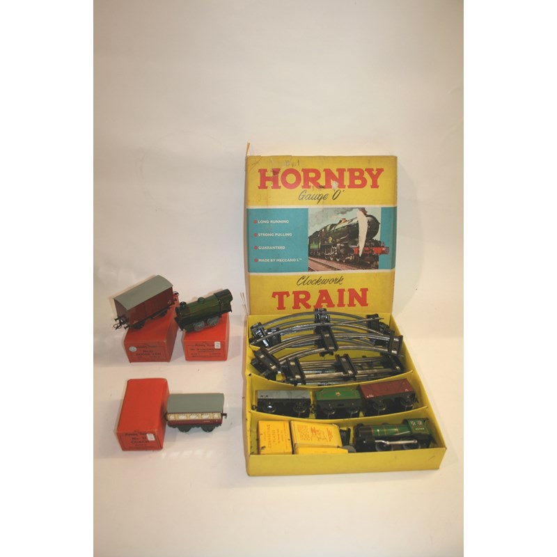 including a boxed Hornby No 30 Goods Set, a boxed No 50 Goods Van, boxed No 21 Coach, boxed No 20 Locomotive, boxed CA1 Acute-Angle Crossing, and boxed track.