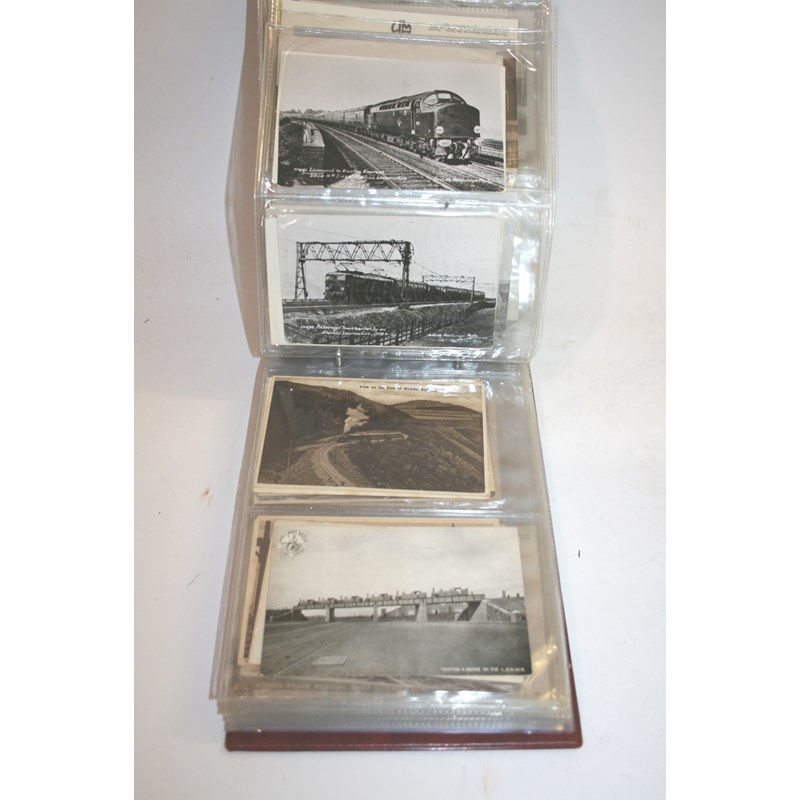 a collection of Railway postcards in albums, including coloured and black and white examples. Including British Railways, Great Western, Kingham Station 1954, Exeter Locomotive, Winston Churchill Locomotive, Ilfracombe Locomotive etc. Also with three albums of Railway photographs, most annotated on the reverse, and some general postcards including GB examples.