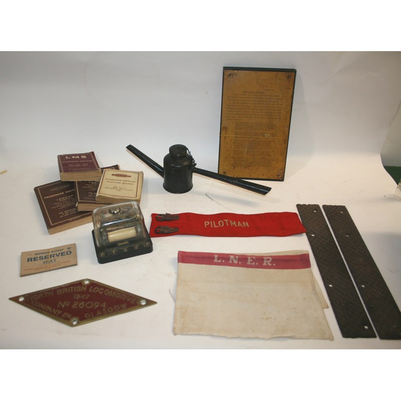 RAILWAY ITEMS various Railwayana including two LMS metal plates, Southern Railway Tickets, information boards, metal can, and various other items.
