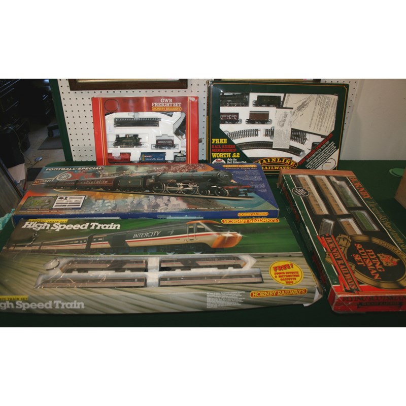 5 TRAIN SETS including Hornby R1007 Football Special, Hornby R535 GWR Freight Set, Mainline Train Set (Collett 3205 Loco), Hornby R548 Flying Scotsman, and R693 High Speed Train Set. (5)
