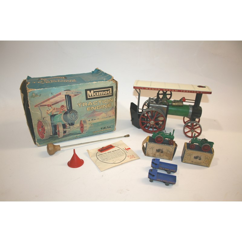 a Mamod T.E.1A Reversing Traction Engine, in it's box and with accessories. Also with two boxed Models of Yesteryear Y1 Alchin Traction Engine (boxes tatty) and 2 unboxed Lesney lorries.