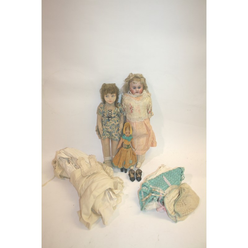 with weighted blue eyes and open mouth, bisque hands and a leather body, and a pair of leather shoes (crack to face). Also with a small Norah Wellings Doll (with a label), and a larger Norah Wellings type doll (unmarked), and a qty of various dolls clothing.
