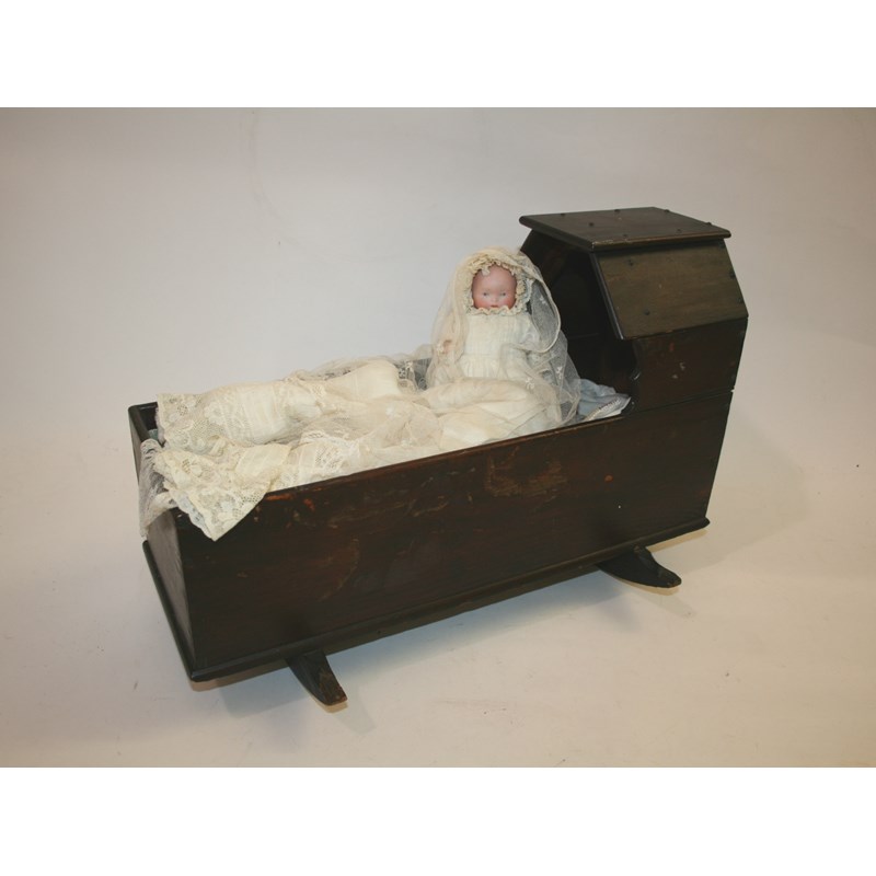 a small Bye Lo type bisque head German doll, with painted eyes and mouth and period dress. Also with an antique cradle and bedding, dated 1900. Doll marked, Germany, 1924, 17/0. 6 1/4ins (16cms) high. (2)