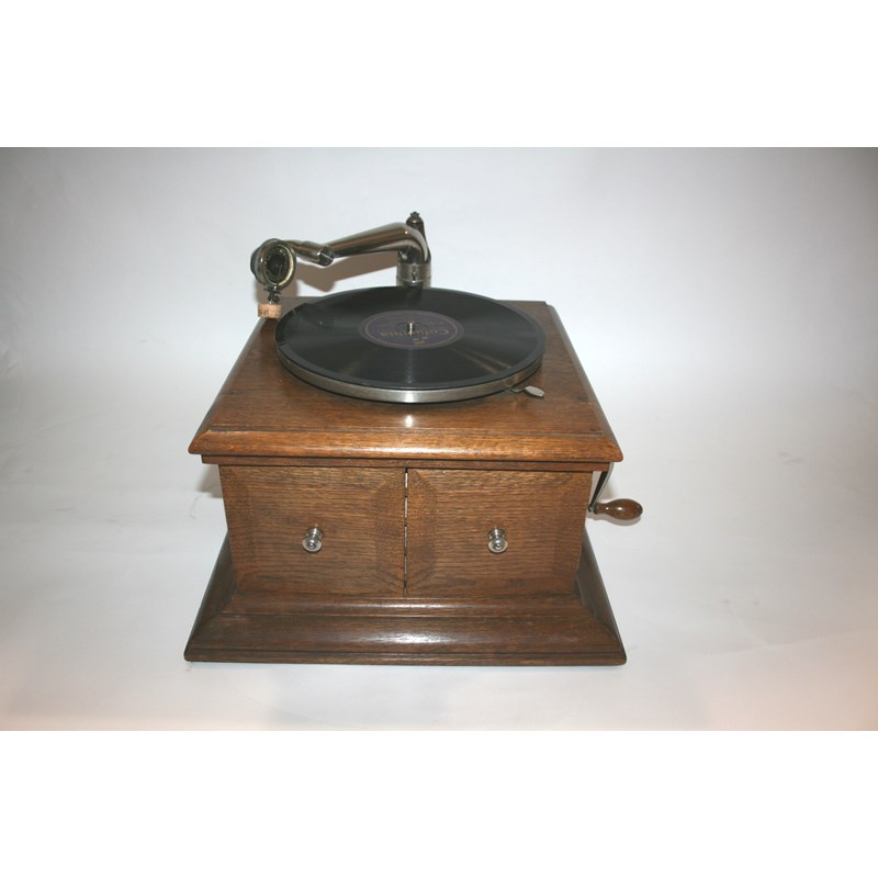 an oak cased gramophone with an Exhibition Gramophone Co Soundbox, with cupboard doors at the front and with it's winding handle.