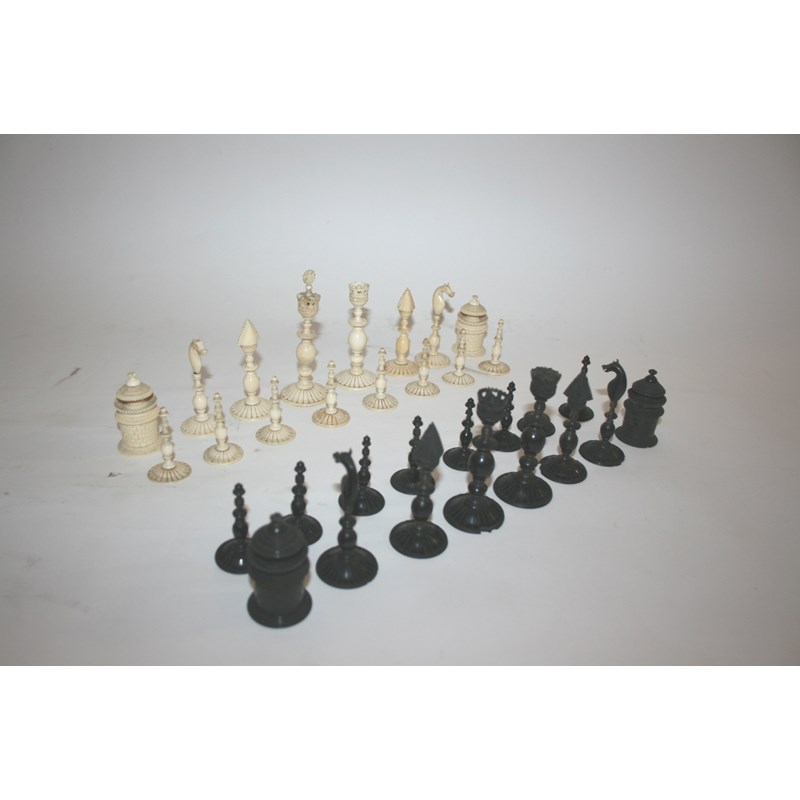 probably Anglo/Indian, the white set in ivory and the black set in horn, carved in detail with the Rooks as towers. Some damages in places, White King 10.5cms high