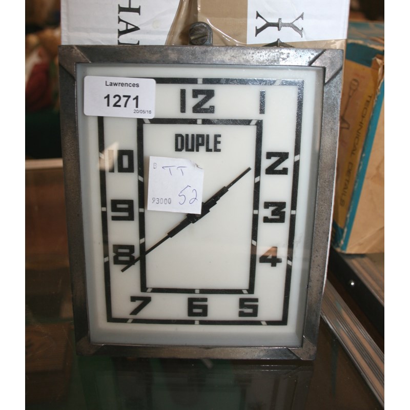 1930'S CLOCK BY DUPLE - BEDFORD COACH with a white dial and black numerals, and in a chrome mount. Formally in a Bedford Coach. 19cms by 15cms.
