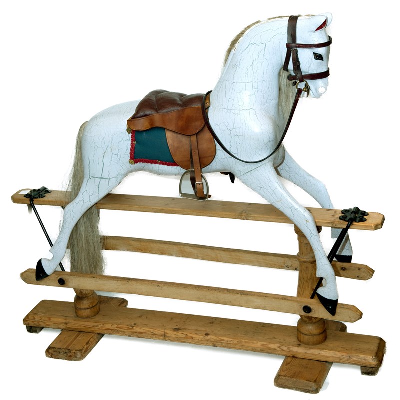 ROCKING HORSE a painted wooden rocking horse with saddle, stirrups and accessories. Mounted on a pitch pine base. 113cms high