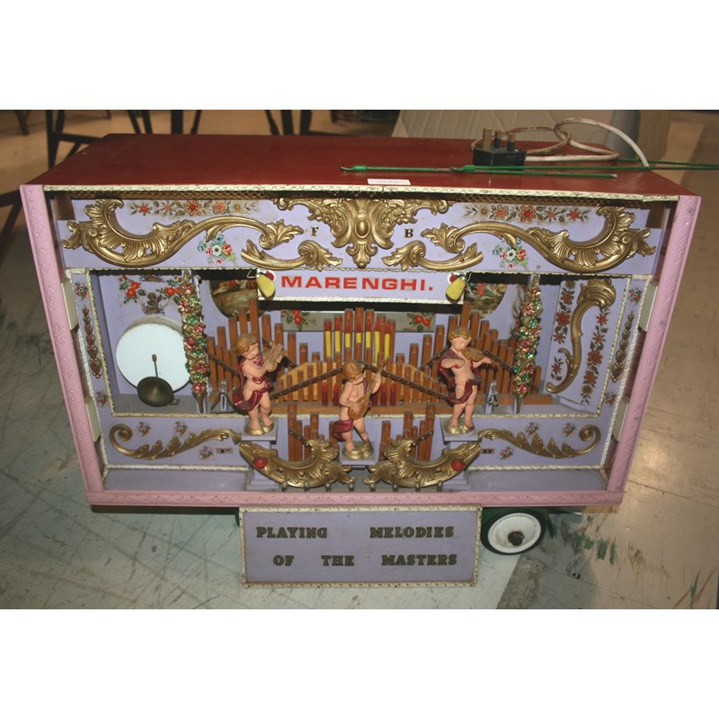MUSICAL MODEL OF A MERENGHI FAIRGROUND ORGAN a wooden made model of a Merenghi Fairground Organ, with an attached electrical lead and in working order. 62cms across