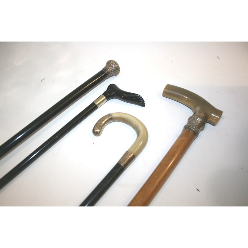 including a horn handled walking stick with silver mount and malacca shaft. Inscribed, J W Hewlett, Paul St, Taunton. Also with two other silver mounted walkings sticks (one inscribed) and a walking stick in the form of a foot. (4)