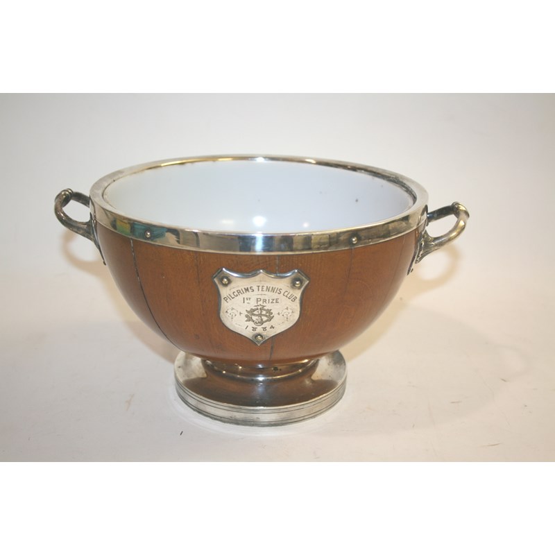 an interesting presentation bowl, made in oak with silver plated mounts by Mappin Brothers, Regent St. With a plaque on the front inscribed, Pilgrims Tennis Club, 1st Prize, 1884. 16.5cms high, 24cms diameter