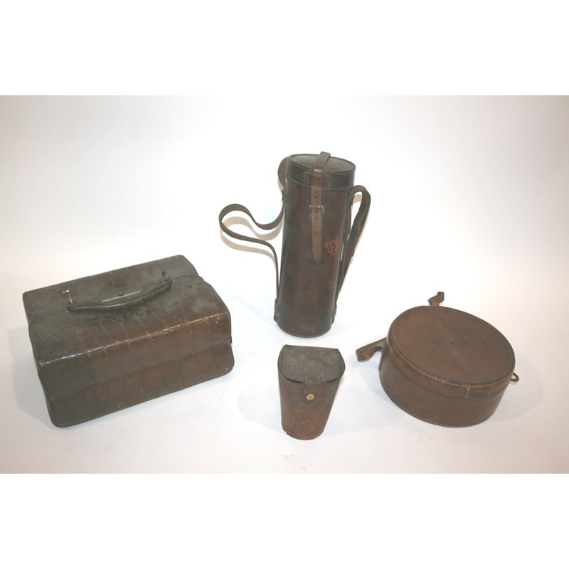 a small crocodile skin gladstone bag with a red leather lined interior. Also with a cylindrical leather case, a leather collar box with collars, and a small leather case containing a glass. 3 items with initials on. Crocodile Case 27cms across. (4)