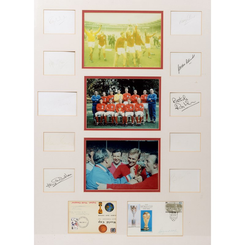 a framed display showing photographs and autographs from the England World Cup winning side of 1966. With 10 autographs (some faded) and Stamp Commemorative Covers, and in a wooden frame. 93 by 70cms