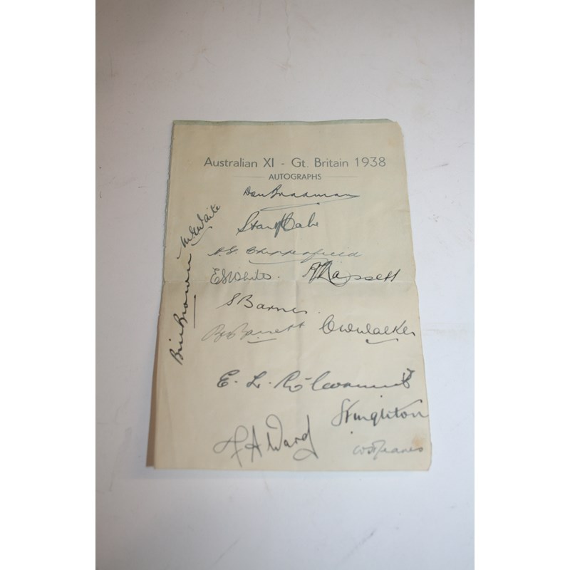 a set of signatures from the Australian Touring Side of 1938, from a match between an Australian XI and Great Britain. Signatures include, Don Bradman, M Waite, Bill Brown, A Chipperfield, L Hassett, E S White, C W Walker, B Barnett, E Mc Cormick, J Fingleton, F A Ward, W Jeanes (Manager), S Barnes, and Stan Mc Cabe. All signed in ink.