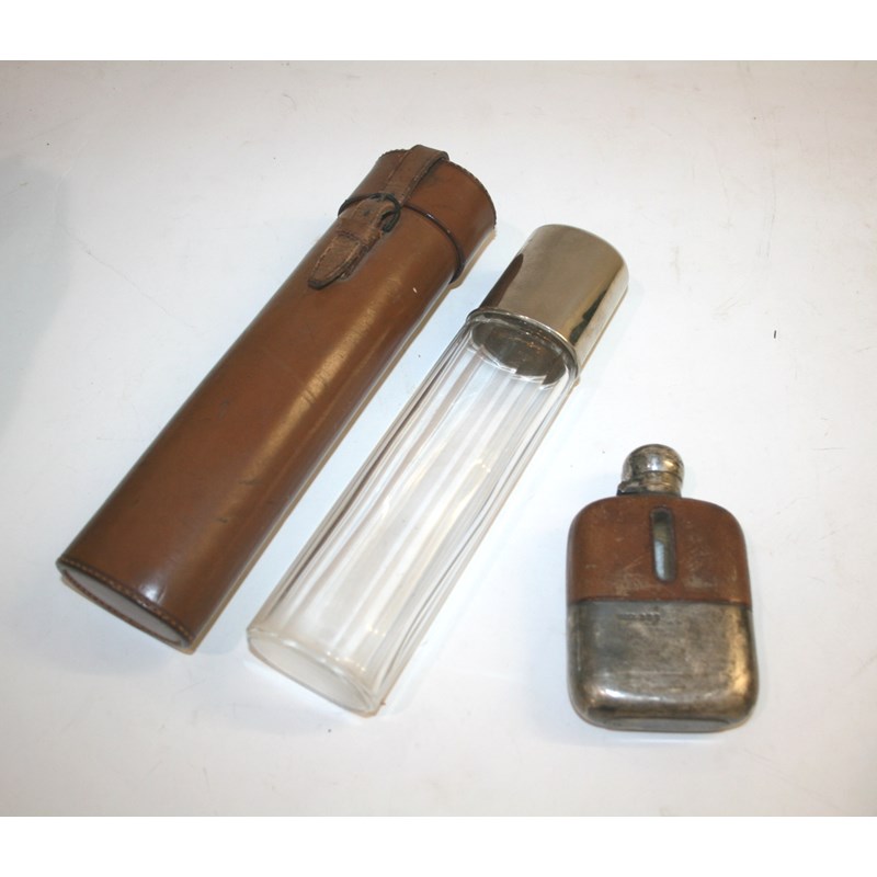 with a screw cap and detachable cup, and with a leather clad top section. By James Dixon & Sons, Sheffield 1922. Also with a leather cased glass flask with screw cap and cup. Spirit Flask 11.5cms high. (2)