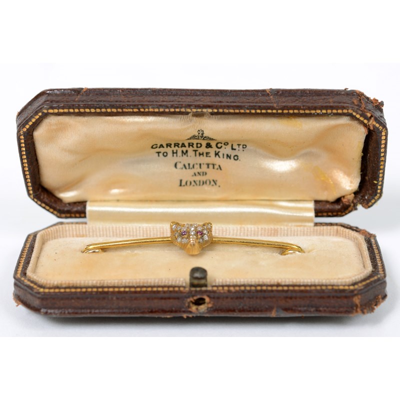 set with rose cut diamonds and ruby eyes (unmarked), and in a box for Garrard & Co Ltd, To H.M The King, Calcutta and London. Also with another hunting stock pin. (2)