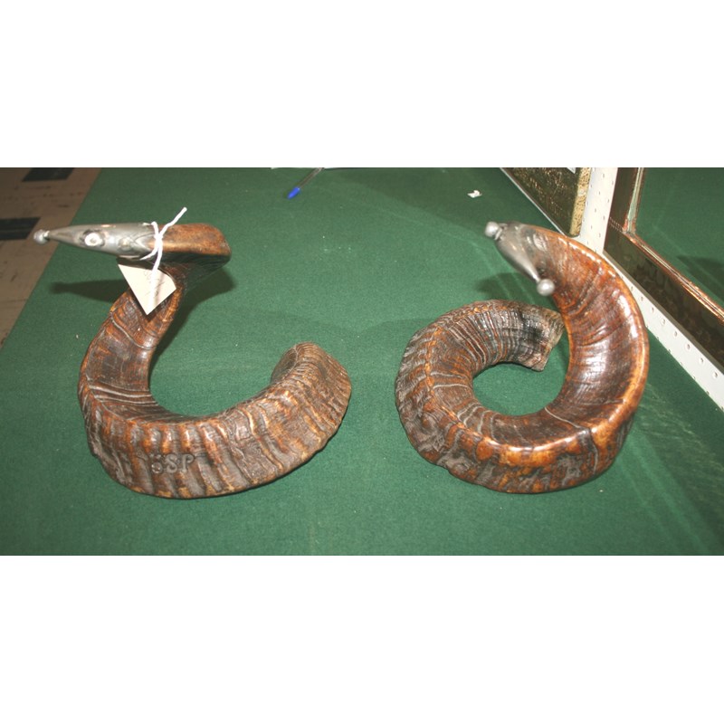 PAIR OF MOUNTED RAMS HORNS a pair of horns with pewter mounts, one with carved initials. (2)