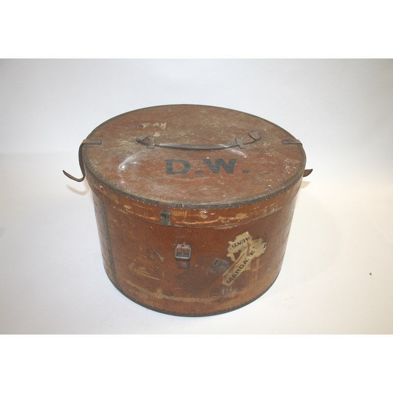 a circular wooden hat box with old travel labels, containing a collapsible top hat by A J White, and 2 bowler hats by A J White & Lock & Co. Box 46cms diameter