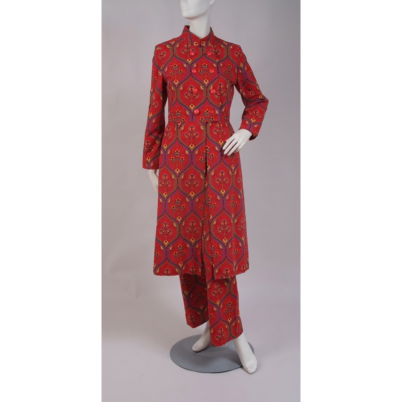 A geometric floral cotton coat with Nehru collar, double breasted with original red buttons, lined. 28" waist. Straight leg trousers with 2" hem, front zip. Inside leg 26", waist 28". Labelled 'SYBIL ZELKER Polly Peck' Model Number 'SU138'. (2)