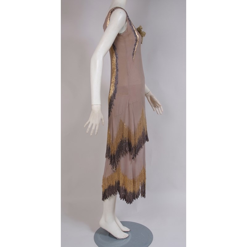 A beautiful light brown georgette dropped waist dress with gold and charcoal grey bugle beads hand-sewn to the edges. The fabric is in a fair condition, although fragile and breaking away where the heavy beads are sewn. The dress has a side opening with poppers and a silk under-slip with side poppers. A pretty silk parasol which originally went with the dress. (2)