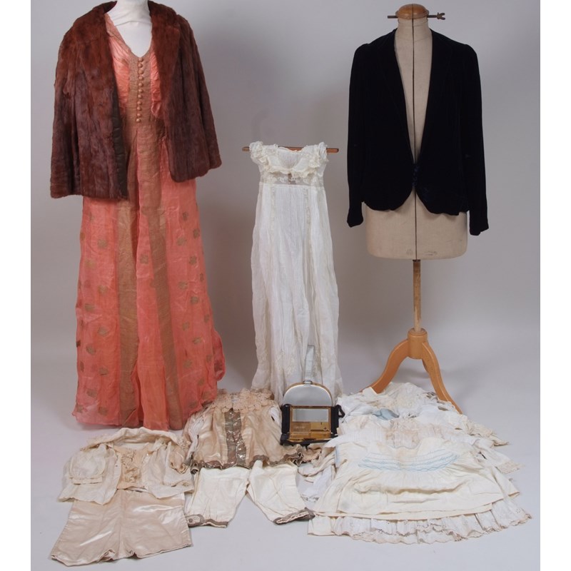 To include a page boy's outfit, a quantity of children's nightgowns and dresses, adult's silk sari dress, a soft silk velvet ladies jacket with crepe de chine lining labeled 'Rosalie Ebeline' and a brown ermine fur coat. (quantity)