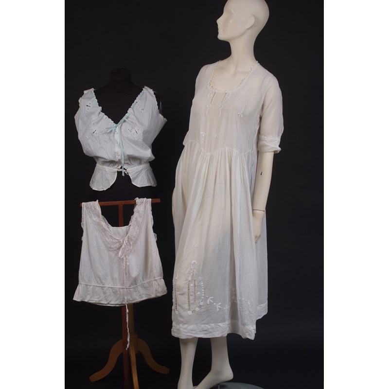 White cotton dress with cutwork and embroidery around the neck and hem. 32" waist. Two embroidered and lace white cotton camisoles. (3)