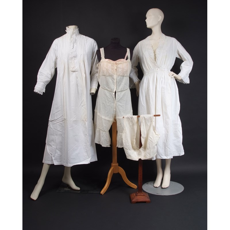 A BOX OF VICTORIAN NIGHT DRESSES & UNDERWEAR Bloomers, and cotton laced night dresses. (quantity)