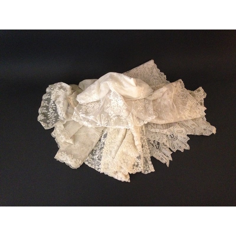 A bundle of period pieces found along with many other items in the attic of a large house in Wales. And a small collection of large men's very soft silk handkerchiefs and a collection of ladies kid gloves. (quantity)