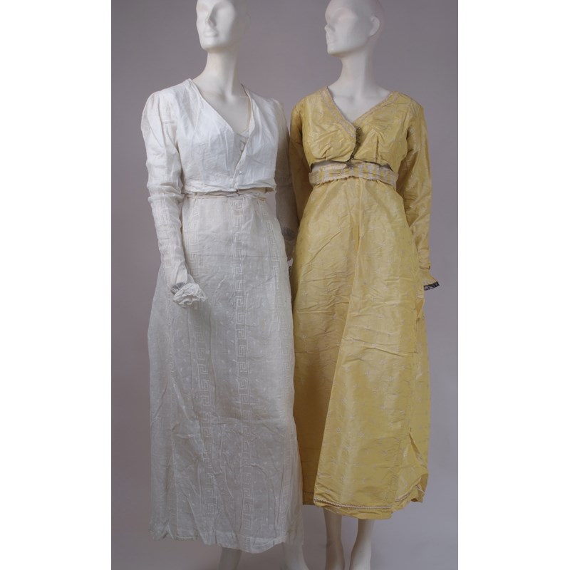 An evening gown of white embroidered muslin, drop-front with Empire waist-line and long sleeves. A further day gown of primrose yellow embroidered taffeta silk, drop waist front, empire line and black lace trims. Belonging to Lady Hood of Avalon wife of famous Capt Alexander Hood (2)