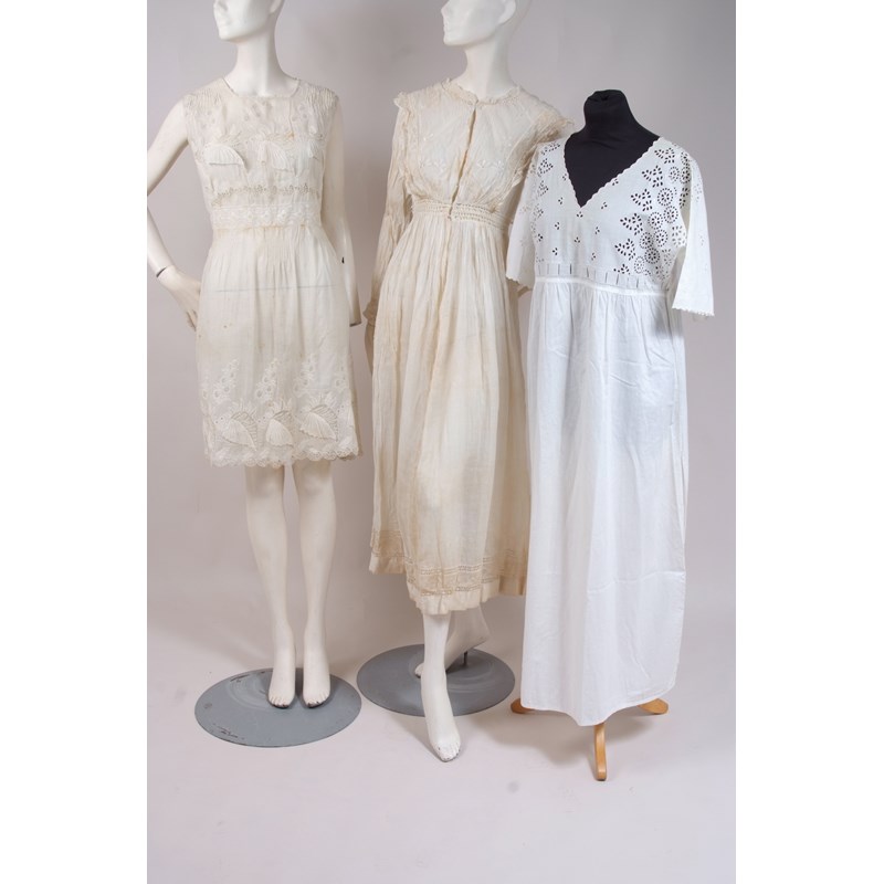 THREE EDWARDIAN COTTON & LACE NIGHT DRESS & SLIPS.