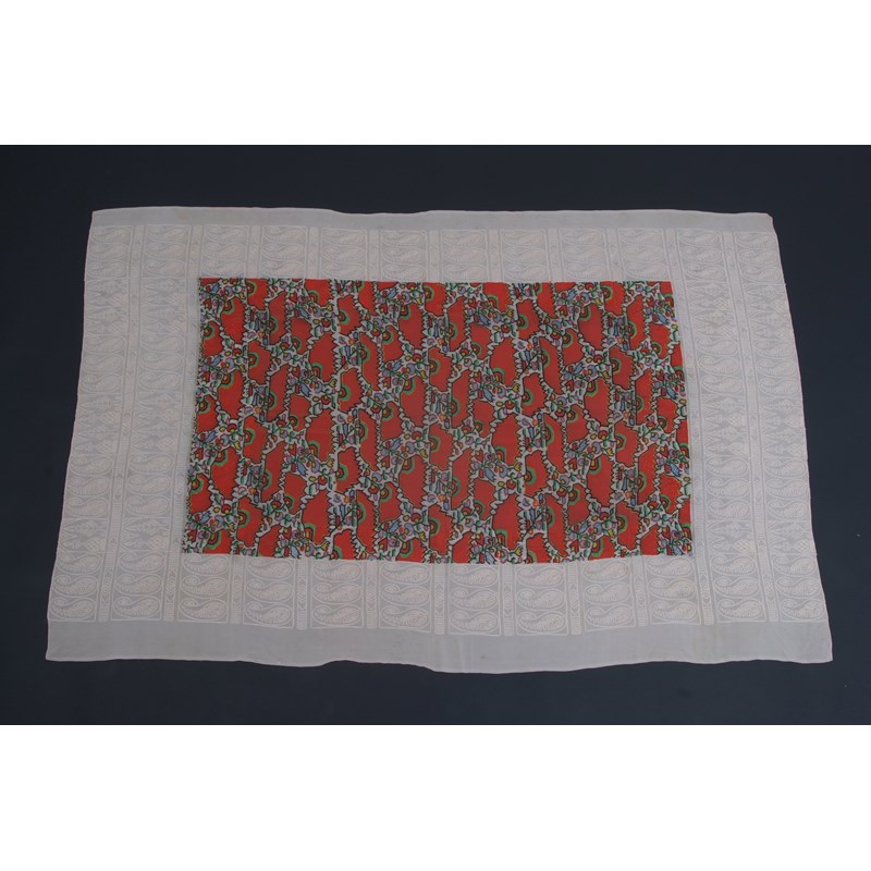 Cream crepe de chine silk shawl with an orange and green geometric print in the central part of the design, surrounded with soutache embroidered in cream silk tear drops (paisley) design. 145" x 96". (1)