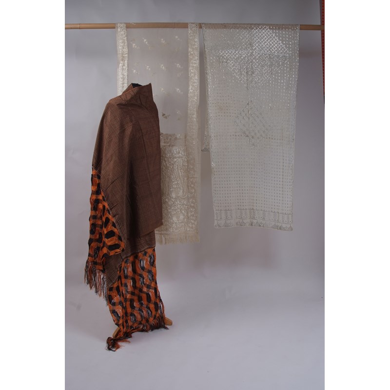 An Egyptian Assuit silver shawl, 208cms x 56cms (few small holes). A cream satin stitch embroidered tulle shawl (musty) 260cms x 53cms. And an African style silk shawl with braided silk threads with a knotted fringe. 274cms x 78.5cms. (3)