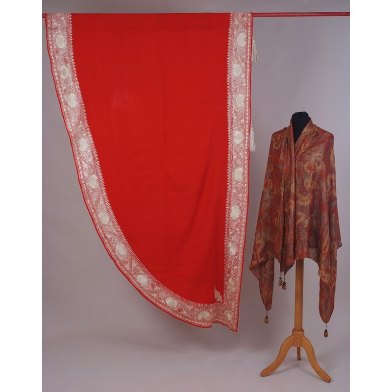 A piano shawl embroidered in silk onto a black silk ground, with fringing all round. 182cms x 182cms. A red Kashmir shawl with white silk embroidery (moth holes) and a further 1920's brocade shawl. 86cms x 172cms. (3)
