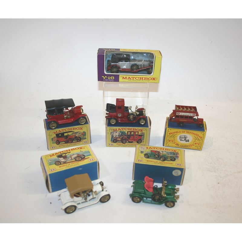 boxed models including Y2 London Bus, Y11 Packard Landaulet, Y2 Renault 2 seater, Y4 Opel Coupe, and Y1 Model T Ford, and Y16 Mercedes Coupe (silver and red). (6)