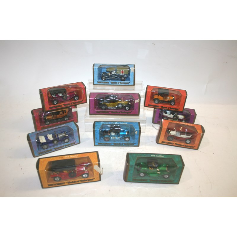 13 boxed models including, Y9 Simplex (Red with yellow seats), Y5 Peugeot (gold body), Y6 Cadillac, Y2 Prince Henry Vauxhall, Y12 Thomas Flyabout, Y4 Opel Coupe, Y1 Model T Ford, Y8 Stutz Roadster (blue body), Y10 Rolls Royce, Y15 Packard Victoria, and Y13 RAF Crossley Lorry, and Y11 Lagonda, and Y16 Mercedes Coupe. (13)