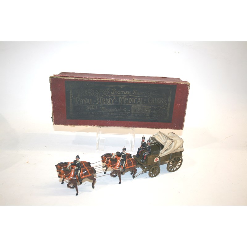Model Number 145, a boxed RAMC Ambulance, with a team of four horses and four figures (two mounted and two seated on the Ambulance).