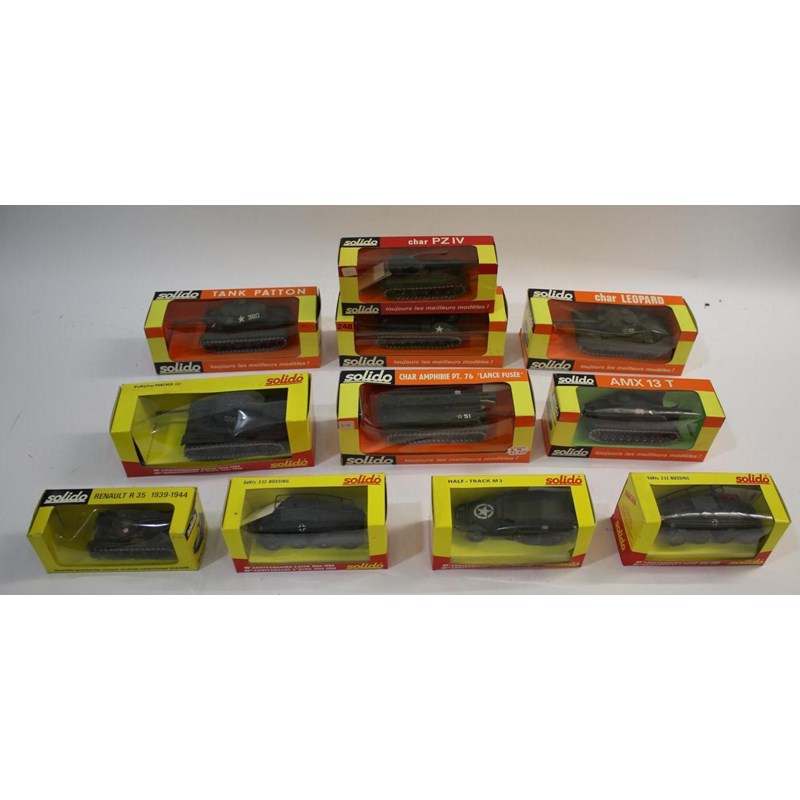 SOLIDO BOXED TANKS 11 boxed tanks including 202 Tank Patton, 248 Char M4I, 243 Leopard, 237 Char, 40th Anniversary 1944-1984, 218 Char, 250 AMX, 233 Renault, and 3 other models. (11)
